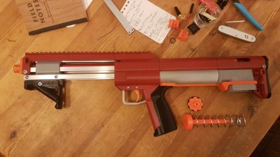 Nebenbei ist der trigger übrigens genial gelöst: dual stage weil der erste switch semi oder burst Feuer auslöst (je nach Einstellung) und wenn man den trigger ganz durch drückt schießt der blaster full auto. Mega geil