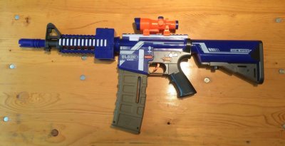 Ich bin heut' in so einen Gebrauchtwaren-Handel gegangen, weil ich eigentlich einen günstigen Computer-Monitor mit Touchfunktion kaufen wollte. Hattense nich. Dafür lag da aber eine Longstrike, die fast komplett war. Es fehlt nur ein Teil des Visiers und dafür waren ein Stampede-Tacgrip, ein Stampede 18er Magazin und die beiden originalen 6er Magazine mit dabei. Fümmenpfirsich Euro. Konnte ich nicht liegen lassen.